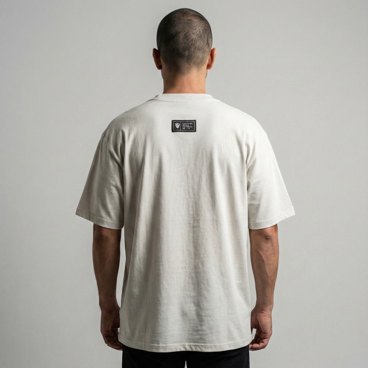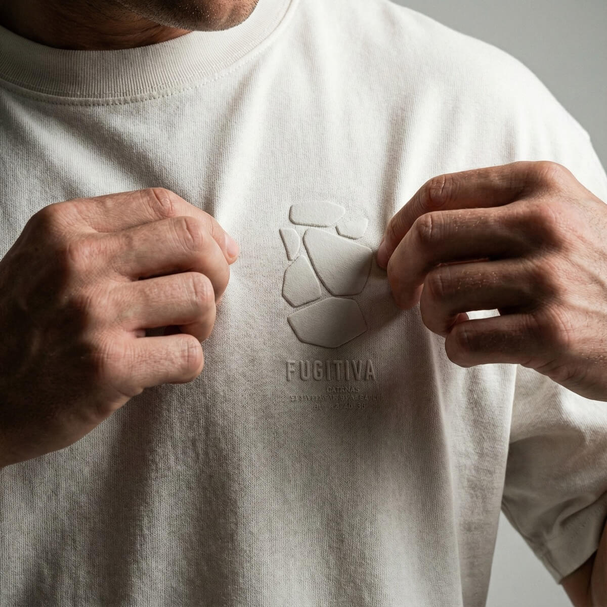 Camiseta de silueta semi — oversize creada en algodón 100% de alto gramaje (260 g.), color blanco marfil y cuello redondo. Estampado frontal tono a tono en alta densidad inspirado en las rocas, garra bordada en la parte superior de la espalda.